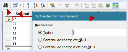 Dans l’application du document, ici Writer, j’affiche la Source de données, menu Affichage > Source de données ou raccourci clavier Ctrl + Maj + F4. En pratique, j’ai ajouté le bouton à ma barre d’outils. Je recherche l’enregistrement en utilisant le bouton ad hoc (les jumelles) qui m’ouvre la même boite de dialogue que dans Base.