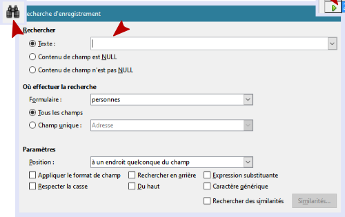 Pour rechercher une personne, j’utilise simplement le bouton de recherche (les jumelles) de Base qui ouvre une boite de dialogue dans laquelle on peut entrer ce que l’on veut : pas de requête SQL à écrire.