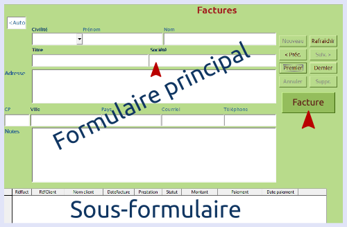 Au moment de la création de ma base de données, je pensais ne gérer que le suivi des factures, le premier formulaire créé a donc un sous-formulaire pour la gestion des factures, car, idéalement, pour un client donné on est susceptible d’en générer plus d’une.