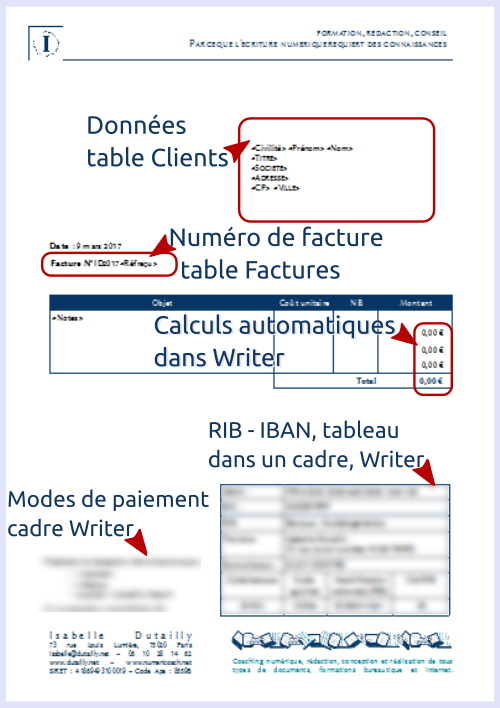 Ça fonctionne aussi bien avec Writer qu’avec Calc, mais, dans Calc, les enregistrements se posent en ligne et tout l’enregistrement, impossible de choisir les champs et leur emplacement. Je devais donc avoir une feuille supplémentaire qui affichait ces données et la facture qui les utilisait, une banale liaison du type : =Cellule source. À partir du moment où il m’a semblé utile d’envoyer des factures au format pdf hybride (donc avec le fichier xml pour un traitement automatique), cette formule ne pouvait pas fonctionner.