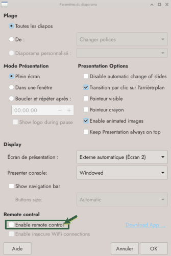 Par ailleurs, la boite de dialogue Paramètres du diaporama, menu Diaporama, a subi un certain nombre de changements (pas encore entièrement traduits à la date de rédaction de ce texte). Il y a, notamment, une nouvelle case à cocher pour activer le contrôle à distance Bluetooth. Les paramètres de la console et de la télécommande ont été déplacés du menu Outils → Option → LibreOffice Impress dans Diaporama → Paramètres du diaporama.