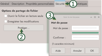 • la boite de dialogue de saisie du mot de passe, propriétés du fichier → onglet Sécurité, indique sa complexité ;