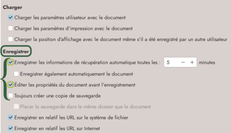 La récupération automatique de fichiers (attention ! Ça ne remplace absolument pas l’enregistrement et la sauvegarde en cours de travail) est maintenant activée par défaut pour une première installation. Comme c’est une donnée du profil, elle ne le sera pas sur une version déjà installée, mais, si vous ne l’avez pas déjà fait, allez faire un tour dans le menu Outils → Options → Chargement/enregistrement → Général pour cocher la case : « Enregistrer les informations de récupération automatique », au besoin, indiquer le nombre de minutes. Personnellement, comme on le voit sur l’illustration ci-dessus, j’ai configuré cinq minutes.