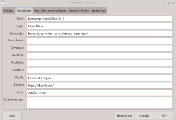 Dans la série changements évidents, la boîte de dialogue Propriétés, menu Fichier → Propriétés suit, enfin, le schéma du Dublin Core (et ça passe bien dans les fichiers EPUB). Sachant que l’auteur reste celui qui est indiqué dans les paramètres généraux de LibreOffice.