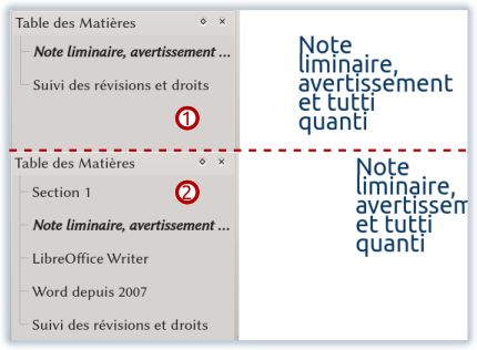 En haut, epub généré avec des scissions à partir des « sauts de page ». En bas, le même fichier mais scindé à partir des « en-têtes » qui sont en fait les titres des chapitres.