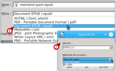 Pour exporter au format epub : Fichier > Exporter choisir Document EPUB , puis la version d’EPUB, 2 ou 3 , de préférence 2 pour une plus grande compatibilité matérielle et la méthode de scission.