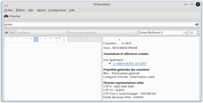 Normalement vous devriez avoir un utilitaire de sélecteur de caractères, soit installé soit, de toute façon, dans votre distribution Linux, personnellement j’ai KcharSelect sur lequel je n’ai aucun avis particulier.