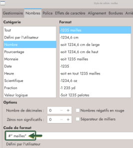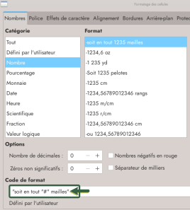 Personnaliser un nombre permet d’ajouter toutes les informations que l’on veut. Dans tous les cas, mettre les éléments de personnalisation, qui sont du texte, entre guillemets :". Soit, on ajoute simplement une unité après le nombre par exemple, ici "mailles", noter que l’espace est incluse dans les guillemets :