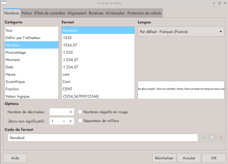 Dans le menu Format → Format numérique, Calc ne montre qu’une partie limitée des possibilités. Pour faire apparaître la boite Formater des cellules on peut soit :