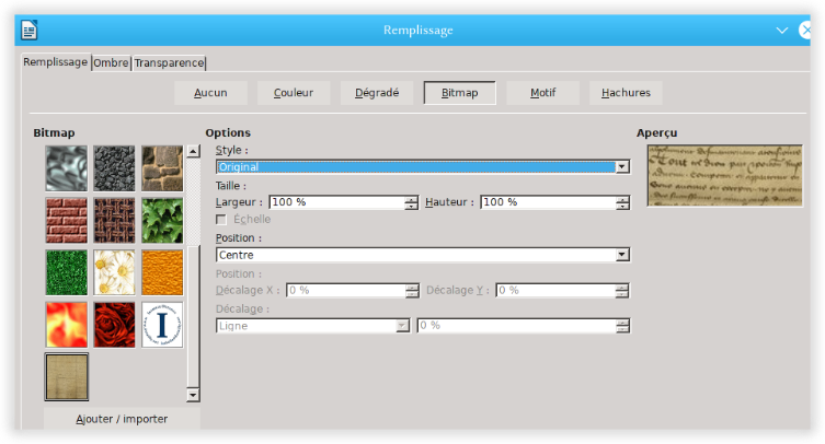 Pour changer le fond, clic-droit dessus, aller sur Remplissage, choisir l’option voulue : couleur, dégradé, image (Bitmap), motif ou hachures. Si, comme dans l’exemple, vous optez pour une image, il faudra l’importer et paramétrer son aspect (mosaïque, étiré, original, etc.).