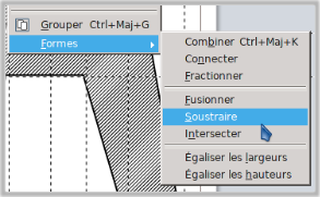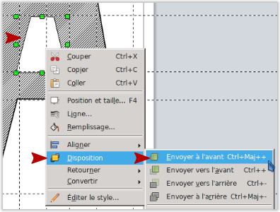 S’assurer que la forme qui est celle de l’évidement est au premier plan : clic-droit sur la forme et Disposition > Envoyer à l’avant.