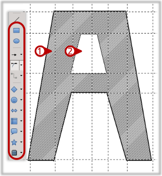 Dans Draw, commencer par dessiner ① une forme, soit à main levée, soit en utilisant l’une des formes proposées par le logiciel. Puis, ② une deuxième si on veut avoir un évidement. Dans l’exemple, c’est un A dessiné à main levée [1] en utilisant l’outil Courbe de Bézier.