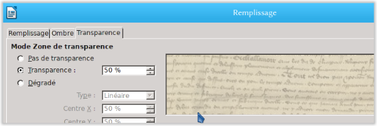 Dans l’onglet Transparence de cette même boite de dialogue Remplissage, régler le pourcentage.