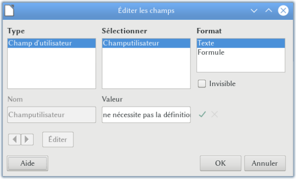 Le champ d’utilisateur de l’onglet Variables n’a pas ce même comportement. D’une part, on n’y accède pas avec les touches de déplacement entre champs qui figurent sur la boite de dialogue Saisie. D’autre part, la modification du contenu du champ se fait par la boite de dialogue Éditer les champs. Cela n’en fait donc pas vraiment un type de champ à utiliser dans un modèle.