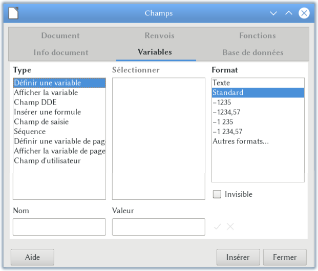Le traitement de texte offre six catégories de champs, dans l’ordre alphabétique :