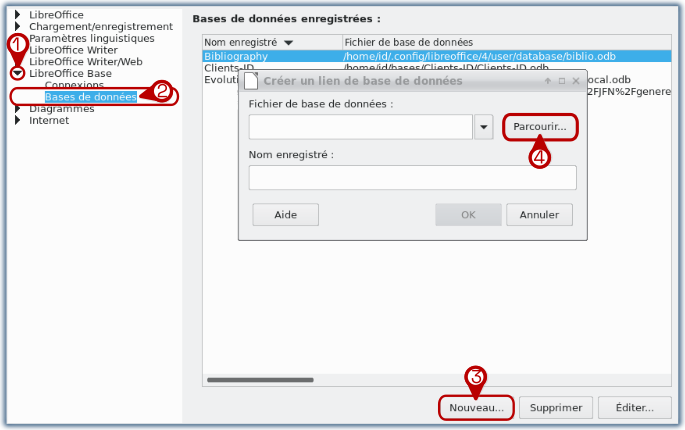 Cliquer sur le bouton Nouveau en bas de la fenêtre ③. Dans la boite de dialogue qui apparaît, aller chercher le fichier de base de données en cliquant sur le bouton Parcourir ④.