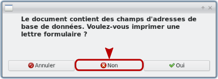 Si on veut l’imprimer, un message va apparaître qui demande si on veut imprimer une lettre-formulaire. Cliquer sur Non sinon Writer va fusionner la lettre-type avec tous les enregistrements de la base de données, ce qui n’est pas du tout ce qu’on veut.