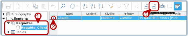 Sélectionner la requête ou la table concernée (ici une requête) ①. Cliquer sur la flèche devant l’enregistrement pour le sélectionner ②, pour finir cliquer sur le bouton Données dans les champs ③. Elles s’afficheront dans le document.
