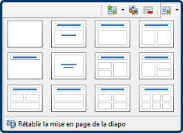 Les mises en page s’attachent à la mise en forme générale de la diapositive : arrière-plan, répartition des éléments tels que définis par le masque qui les sous-tend.