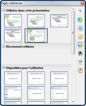 Les pages maîtresses ou conception des diapos ou encore ébauches de diapo concernent les arrière-plans. Les différentes pages maîtresses ajoutent autant de masques à la présentation et on peut les « récupérer » d’autres diaporamas ou modèles.