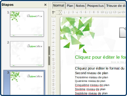 Pour donner un exemple concret, la mise en forme, changement des couleurs et des polices de caractère, de la présentation sur les points forts de LibreOffice prendra moins de trois quarts d’heure si vous vous contentez de modifier l’arrière-plan de masque (les triangles verts, la bande grise et le logo LibreOffice) en laissant les éléments à la même place et deux petites heures environ si vous optez pour un arrière-plan radicalement différent et une répartition différente des objets, auquel cas il faudra retravailler les diapositives pour tout remettre d’équerre. La version de ce diaporama a encore quelques défauts techniques, sinon cela prendrait encore moins de temps.