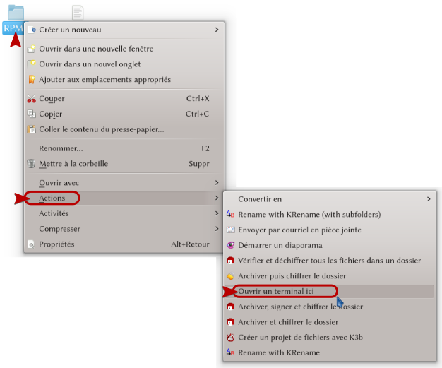 Dans chacun, aller sur le sous-dossier RPMS de chaque répertoire, faites un clic-droit dessus puis Action > Ouvrir un terminal ici. La console s’ouvre juste au bon endroit, inutile de prendre l’escalier.