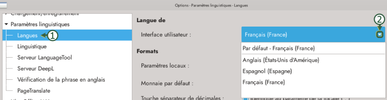Une fois la langue installée, aller dans Outils → Options → Paramètres linguistiques → Langues ①, à droite cliquer sur la flèche de liste déroulante ② pour choisir la langue.