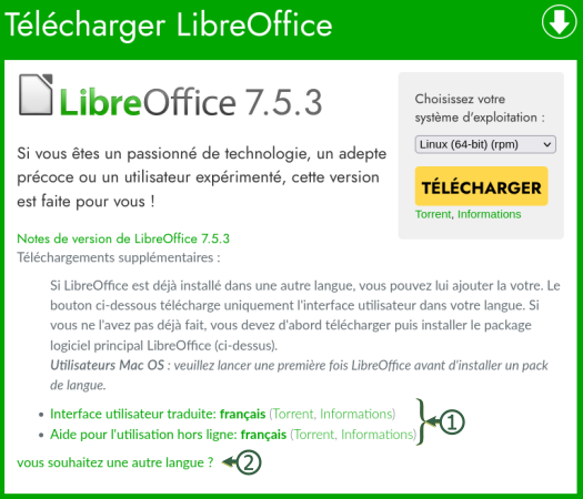 - « Interface d’utilisateur traduite en français », et, au besoin (je le conseille) « Aide pour l’utilisation hors ligne en français » ① ;
