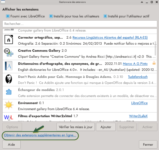Il faut commencer par les récupérer. Au plus simple, aller dans Outils → Gestionnaire des extensions et cliquer sur le lien en bas « Obtenir des extensions supplémentaires ». Ilvous mènera tout droit sur le site extensions.libreoffice.org qui répertorie aussi bien des extensions (petits programmes ou macros qui ajoutent des fonctionnalités à LibreOffice) que des modèles.
