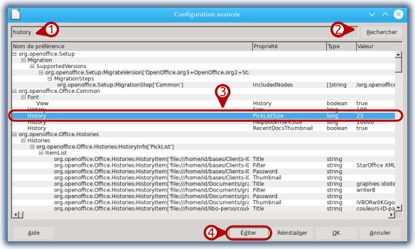 Pour modifier ce nombre de fichiers, on va changer la propriété PickListSize qui se trouve dans les préférences History.