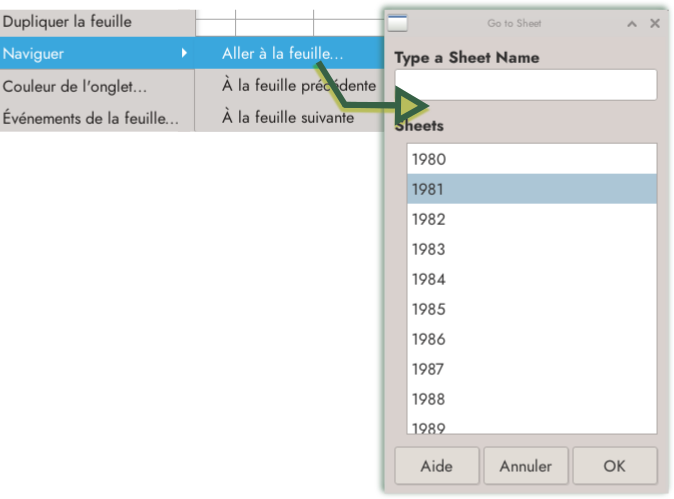 Cette toute nouvelle fonctionnalité vous permet d’aller directement sur une feuille du classeur, extrêmement utile quand ils ont beaucoup de feuilles. Il faut aller dans le menu Feuille > Naviguer > Aller à la feuille. D’où l’intérêt, soit dit en passant, de nommer correctement les feuilles de classeurs.