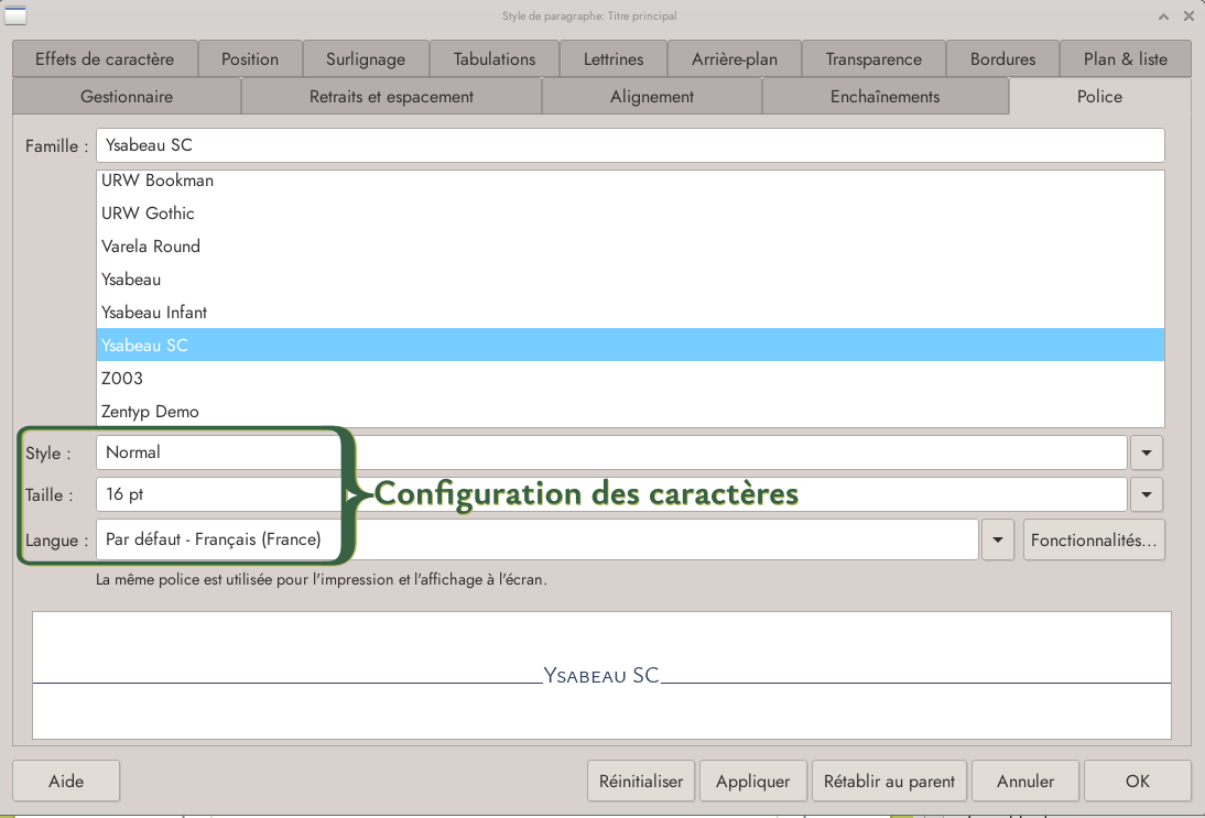 Boite de dialogue format de polices