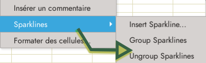 Un diagramme Sparklines est un graphique qui tient dans une cellule et porte sur une ligne ou une colonne. Pour l’ajouter, il faut faire un clic droit sur une cellule et aller sur Sparklines > Insert Sparkline (donc en version française Insérer un Sparklines).