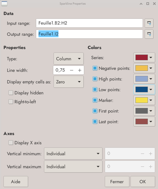 Il faut indiquer la plage d’entrée (Input sur l’illustration), donc une ligne ou une colonne et la plage de sortie (la cellule dans laquelle sera le graphique). On paramètre l’allure : colonnes ou lignes, les couleurs etc. Et on appuie sur OK.