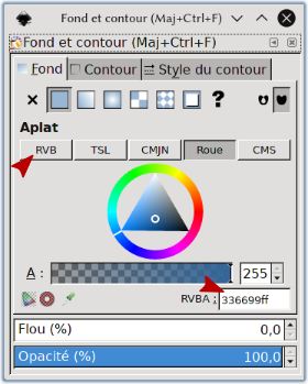 Pour trouver ces informations, on peut ouvrir une application de dessin. Ici, par exemple Inkscape ou la répartition des couleurs selon les modèles RVB, TSL ou CMJN figure dans des onglets séparés, le code hexadécimal figure en fait dans la case RVBA. Ce sont les six premiers nombres de la case, les deux dernières lettres indiquant le degré d’opacité de la couleur. Pour avoir ces informations, dessiner une forme quelconque, clic-droit, aller sur Fond et contour remplir le fond de la couleur.
