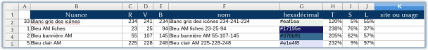 En les gérant de cette façon, je peux facilement les trier, les exporter, les copier. Et, je ne le fais pas toujours, je peux aussi colorier la cellule de la couleur concernée et avoir ainsi un rendu immédiat.