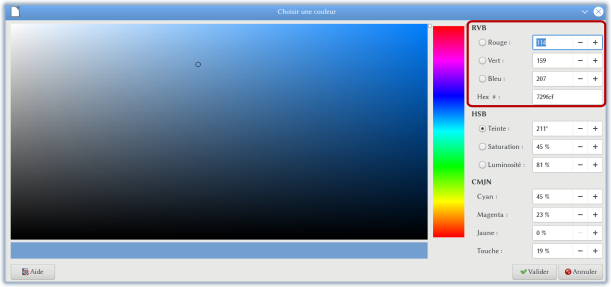 Les palettes au format GPL pour Gimp et Inkscape réclament aussi les données RVB (rouge-vert-bleu) et si, ce qui est probable, la palette doit avoir d’autres usages les valeurs TSL (teinte-saturation-luminosité) ou CMJN (cyan-magenta-jaune-noir) peuvent être utiles et, évidemment un nom plus facile à mémoriser, par exemple « bleu foncé Mageia ».