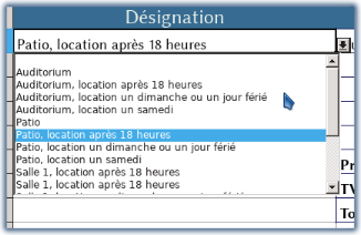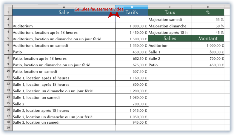 Les données : ici, une liste des salles avec les variantes qui conditionnent les tarifs ainsi que les montants de location. Lesquels montants, soit dit en passant sont calculés à partir du tarif de base de chaque salle.