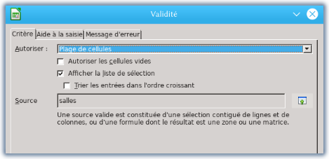 Dans la feuille « devis », sélectionner les cellules concernées de la colonne A, ici, de A4 à A8. Aller dans Données > Validité (dans Excel onglet Données > Validation des données). Dans le cartouche Autoriser, choisir Plage de cellules (dans Excel sélectionner Liste), indiquer le nom de la plage, ici « Salles ». Au besoin, on peut ajouter un message d’aide à la saisie ou un message d’erreur, ce qui est très conseillé quand plusieurs personnes doivent travailler sur ce genre de tableau.