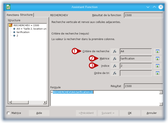 ④ L’Ordre de tri (Valeur proche) indique si la première colonne de la matrice, ici la plage « tarification », est triée en ordre croissant. Ce qui est conseillé pour des questions de rapidité et pour avoir une valeur proche si le tableur ne trouve pas la correspondance exacte [2], dans ce cas, laisser le critère vide. Quand les listes ne sont pas triées, la valeur de recherche doit être absolument identique, sinon le tableur renvoie un message d’erreur, dans ce cas indiquer FAUX. C’est un paramètre facultatif.