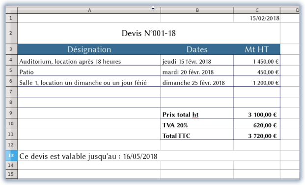 Dans le cadre de ce tutoriel, on utilisera les fonctionnalités plages et expressions nommées (noms définis dans Excel) et les options de validité (ou de validation) des cellules ainsi que la fonction RECHERCHEV. Les captures d’écran sont faites à partir de Calc de LibreOffice 6 mais cela fonctionne à l’identique pour les autres versions et de façon similaire, à quelques nuances près dans Excel. Le point de départ de ce tutoriel est plus ou moins fictif puisqu’il s’agissait d’établir un devis de façon quasi-automatique. Le devis exemple et parfaitement fictif est offert en téléchargement au format ods.