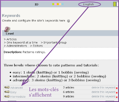 Quand les mots-clés sont uniquement dans une langue, ils ne s’affichent que si l’on travaille dans la langue du mot-clé.