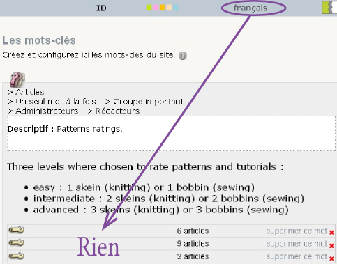 Si, pour une raison ou pour une autre, ce qui a été le cas pour le site aiguilles-magiques, certains mot-clés ou expressions n’ont et n’auront pas d’équivalents dans les autres langues du site, il faut tout de même mentionner les indicatifs des autres langues :