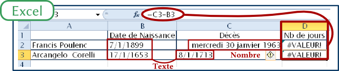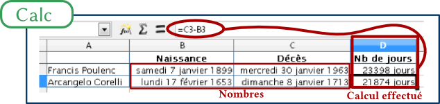 Calc, quant à lui n’a pas de problème existentiel et me met le format de date, donc de nombre, que je veux et me donne le nombre de jours que Poulenc, né le 7 janvier 1899, un poil trop tôt pour Microsoft, et mort le 30 janvier 1963, a vécu (23 398 jours) ainsi que ceux d’Arcangelo Corelli né en 1653 et mort en 1713, soit 21 874 jours.