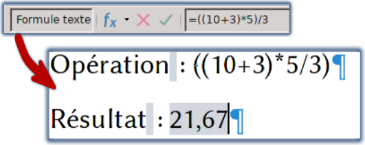 Saisir la formule dans la barre du même nom comme on le ferait sur un tableur. Ici j’ai demandé à Writer de calculer cela : ((10+3)*5/3), donc une opération « relativement » complexe, plus qu’une simple opération en tout cas, le résultat, tout à fait correct, est 21,67 (en fait 21,666666…, Writer a arrondi).
