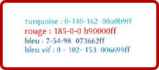 Si l’objectif est de travailler sur un site internet, de réfléchir à une charte graphique..., bref de suivre une palette de couleurs bien définies, autant ajouter sur la feuille de travail celles que l’on utilise avec, en ce qui me concerne pour un site internet, les références RVB et le nom hexadécimal, mais on peut aussi noter les références CMJN [5] si on veut.