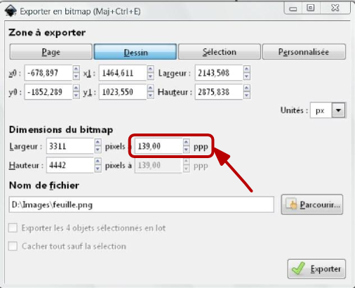 Menu Ficher d’InkscapeOn peut aussi utiliser le raccourci clavier Maj+Ctrl+E pour exporter l’image. - dans la boite de dialogue, on va chercher l’endroit, on donne un nom [2], et on choisit la résolution [3], 72 ppp pour un site internet. La taille de l’image sera modifiée en fonction de la résolution sans perte de qualité pour les éléments vectoriels [4].