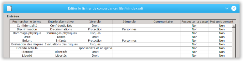 La colonne Respecter la casse peut être soit vide soit avoir comme valeur le chiffre 0 si on ne veut pas que Writer la respecte. On doit saisir 0 dans la colonne Mot uniquement pour les mêmes raisons. Utiliser les fonctionnalités de remplissage de Calc au besoin pour aller plus vite. Plus précisément, j’ai constaté que si on laissait la colonne Mot uniquement vide, elle est interprétée comme Oui contrairement à ce qu’affirme l’aide.