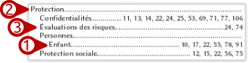 La première colonne est le terme à rechercher par exemple Enfants, la deuxième une variante Enfant. Les colonnes 1re et 2e clé permettent de faire des regroupements par catégories, par exemple : ③ Protection, première clé, ② Personne, deuxième clé, ① Enfant, entrée [1].