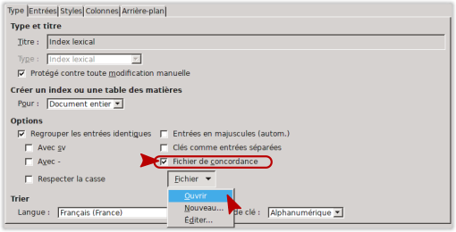Dans le champ Type, choisir Index lexical, cocher l’option Fichier de concordance puis Ouvrir pour aller chercher le fichier.
